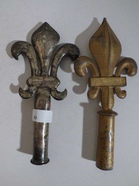 Lot de 2 piques de drapeaux de parement, à la fleur de lys, en fer blanc. Époque Restauration
