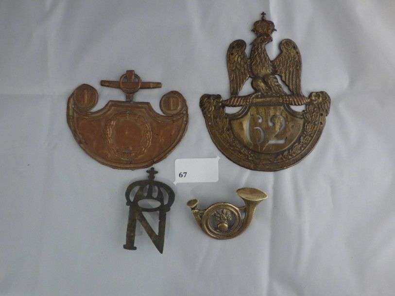 Lot de 4 plaques de shako et divers: au modèle 1812 du 62e, Des équipages de la ligne 1ere division, Cor de Voltigeur, N couronné.