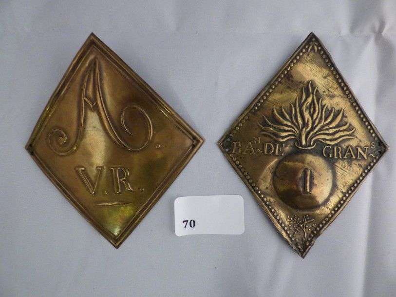 Lot de 2 plaques losangiques de shako, en laiton estampé: motif à la grenade chiffrée I et marqué «Ban De Grans»| marqué «AVR».