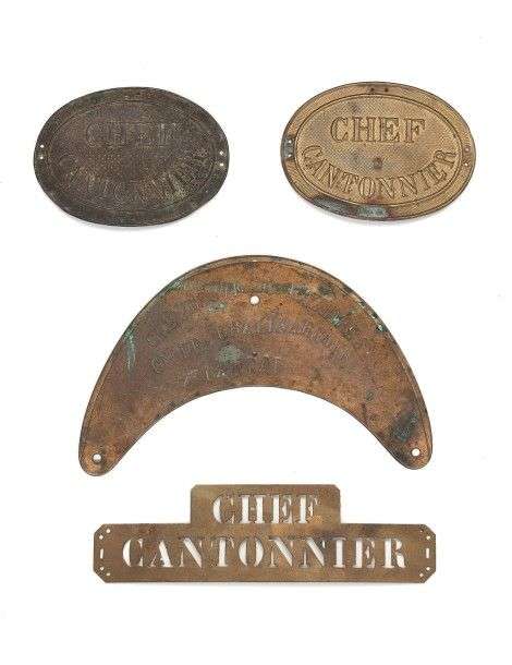 Lot de 4 plaques de fonctions: 3 de Chefs Cantonniers, 1 type hausse-col marquée «Cheyrouze à Mazieres Cne de Chalinargues».