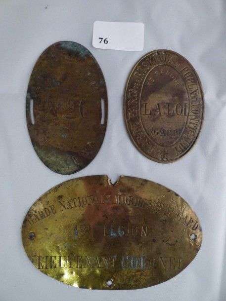 Lot de 3 plaques, ovales, en cuivre: Ville de Perpignan Portefaix N°20| Garde Particulier des Réserves de Pouls et Monticaudy La Loi (Gard)| Garde Nationale Mobilisée du Gard 1ère Légion Lieutenant-colonel.
