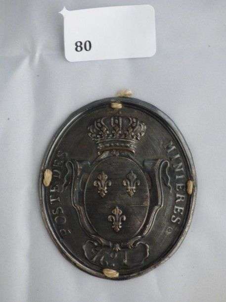 Plaque de fonction, ovale, en cuivre, estampé, argenté: Postes des Minières N°1. Motif aux Armes de France. Restauration