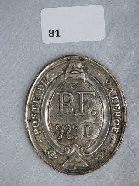 Plaque de fonction, ovale, en cuivre estampé, argenté: Poste de Valence N°1, poinçonné DF.