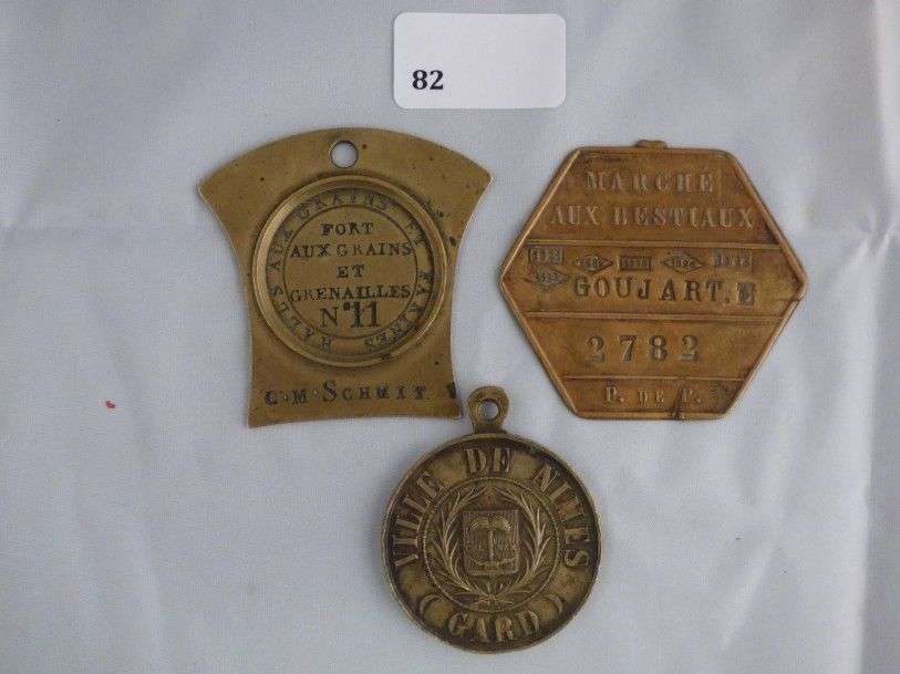 Lot de 3 insignes de fonctions: Ville de Nîmes (Gard) Portefaix N°384, Marché aux bestiaux au nom Goujart poinçonné des années 1921 à 1926, Halls aux grains et France Fort aux grains et grenailles N°11 au nom de C.M Schmit.