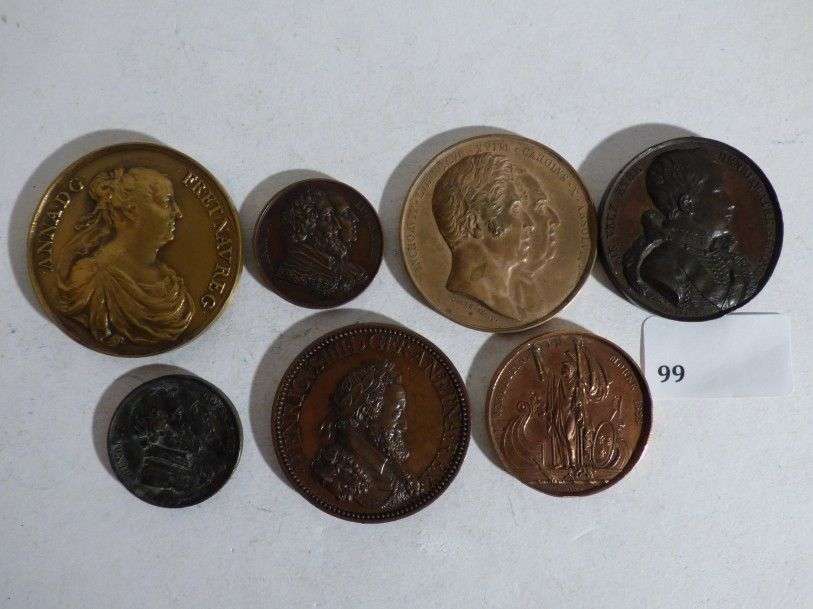 Lot de médailles de table, à sujet de la Famille de Bourbon: Louis XVII, Charles X, Henry IV, Pour la statue de Henry IV (x2), Expédition en Morée en 1828, Je veux être Henri IV Second, Louis XIV et Anne d'Autriche (retirage).