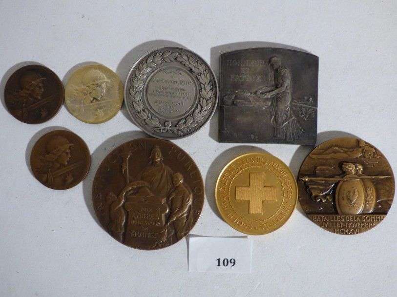 Lot de médailles de table, à sujet de la guerre 1914 1918: Verdun, Bataille de la Somme, Prix Sous-lieutenant Tattet, Aux Maîtres Mort pour la France (attribuée), La ville de Saint Étienne à ses Morts (attribuée), SSBM.