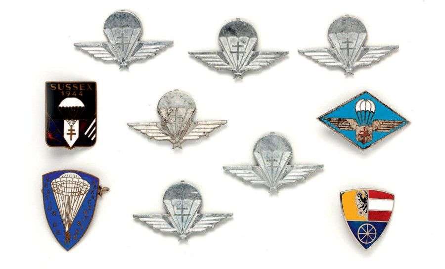 Lot d'insignes de la France Libre, Parachutistes, Sussex 1944, 1è Compagnie de Chasseurs-Parachutistes FFL… (10 pièces env.)