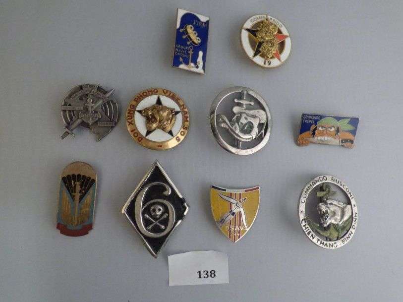 Lot d'insignes commandos de l'Indochine, dont certains fabrication locale.