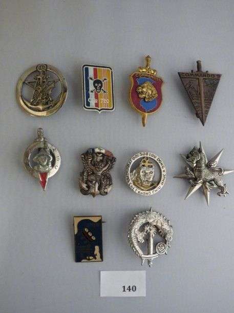 Lot d'insignes commandos de l'Indochine, dont certains fabrication locale.