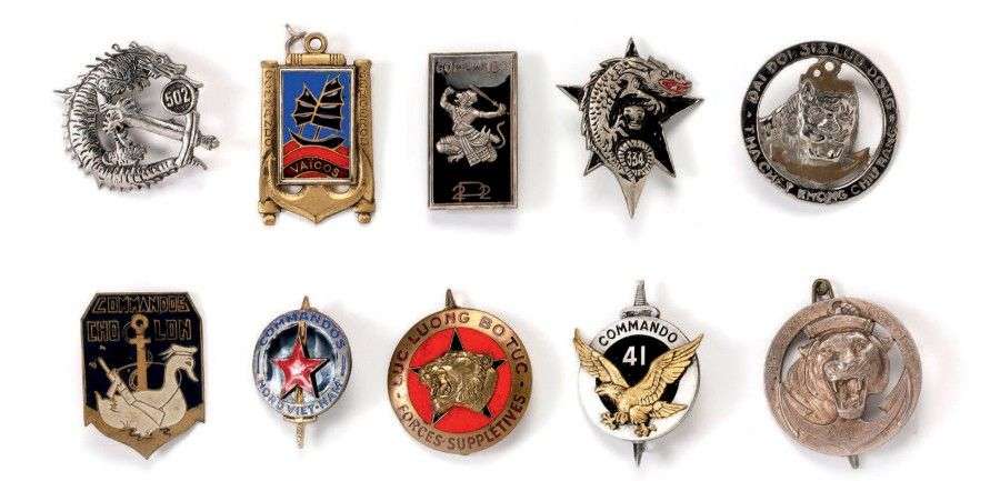 Lot d'insignes commandos de l'Indochine, dont certains fabrication locale.