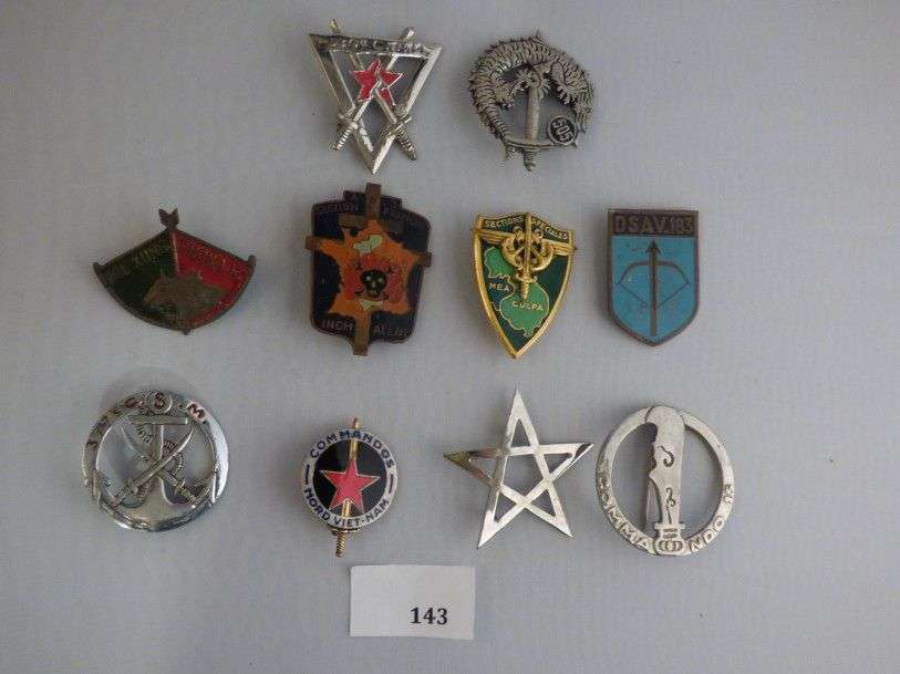 Lot d'insignes commandos de l'Indochine, dont certains fabrication locale.
