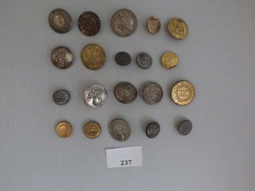 Lot de boutons, de l'Ancien régime à Louis-Philippe, dont Trésorerie nationale, District de Chartres, District d'Alais, District d'Embrun, Lycée de Montpellier, Eaux et forêts royales… (20 pièces env.)