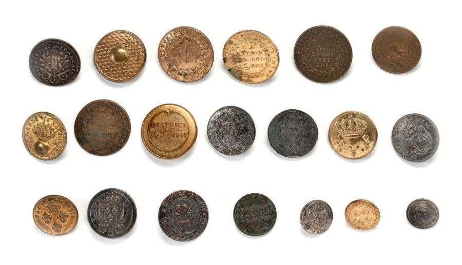 Lot de boutons, de l'Ancien régime à Louis-Philippe, dont Pages du Roi, Garde royale, District d'Alais, District de Clermont, District de Crest, Hôpitaux militaires, Garde nationale, Gardes nationales de France, Aide de Camp… (20 pièces env.)