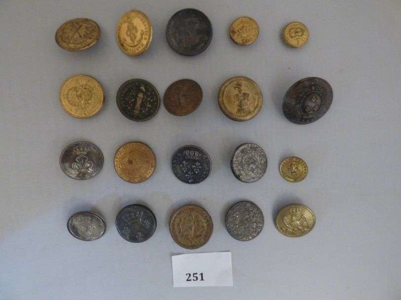 Lot de boutons, de l'Ancien régime à Louis-Philippe, dont Douanes royales, Pompiers de Vendôme royal, Officier du Génie, Garde impériale… (20 pièces env.)