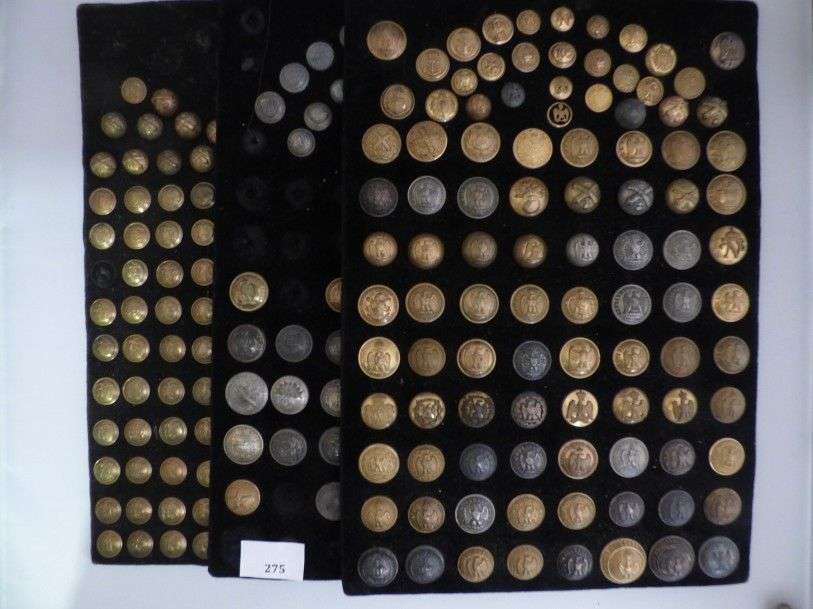 Lot de 3 panneaux de présentation de boutons, principalement Second Empire, dont de Maréchaux de France, de Généraux, de la Maison impériale, Corps législatif, de Régiments.