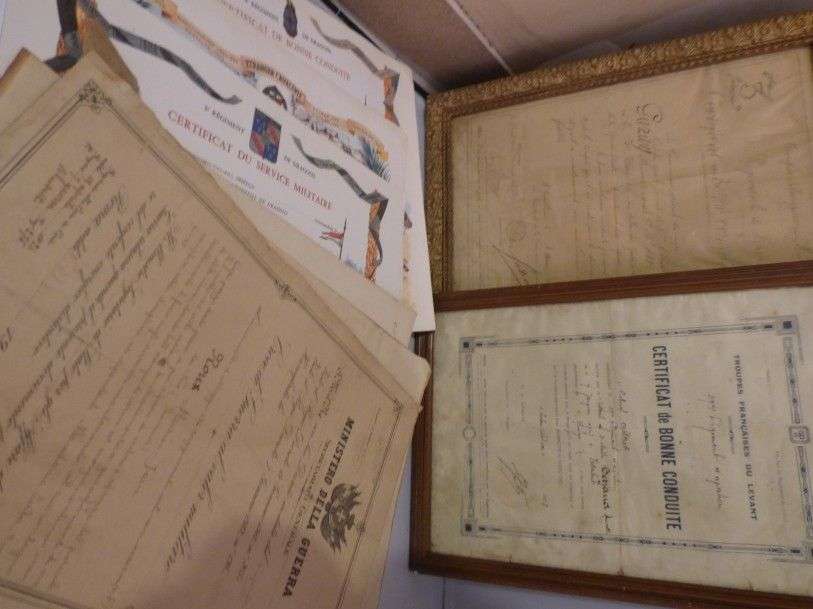 Lot de diplômes, illustrations et certificat de bonne conduite, huile sur