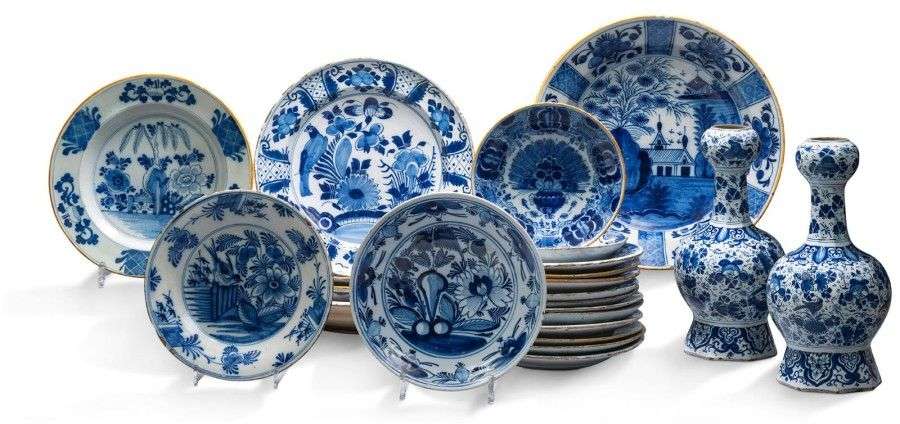 Important ensemble en faïence de Delft à décor en camaieu bleu (différents décor) comprenant seize assiettes, six plats et une paire de vases.