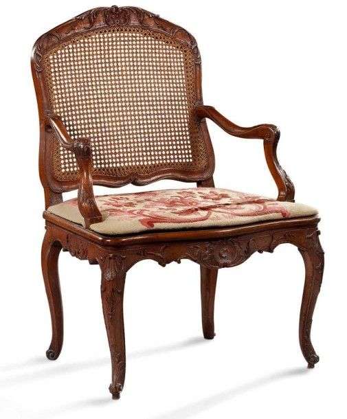 Fauteuil à dos plat en bois naturel mouluré et sculpté, d'acanthes, coquilles et fleurettes.