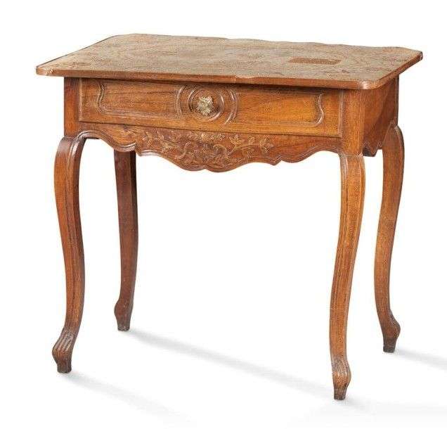 Elle ouvre par un tiroir en ceinture et repose sur quatre pieds cambrés nervurés