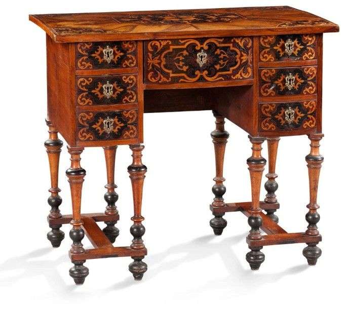 Petit bureau Mazarin de forme rectangulaire en placage de noyer, à décor en marqueterie de bois de couleur.