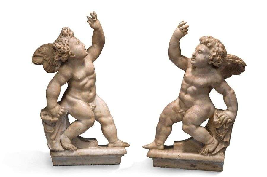 Paire d'anges en marbre, assis sur des entablements