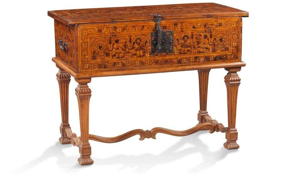 Coffre de forme rectangulaire à décor en marqueterie de bois clair et bois