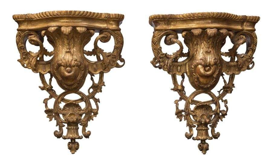 Paire de consoles d'appliques en bois ajouré, sculpté et doré, à décor de panaches, coquille, acanthes et enroulements