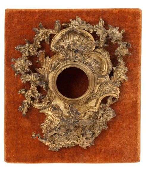 Rare porte montre en bronze très finement ciselé et doré à décor de dragon, escargot, et lapin dans des enroulements rocaille feuillagés et fleuris.
