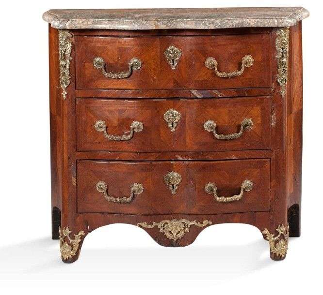 Petite commode de forme arbalète, marquetée en feuille dans des encadremen