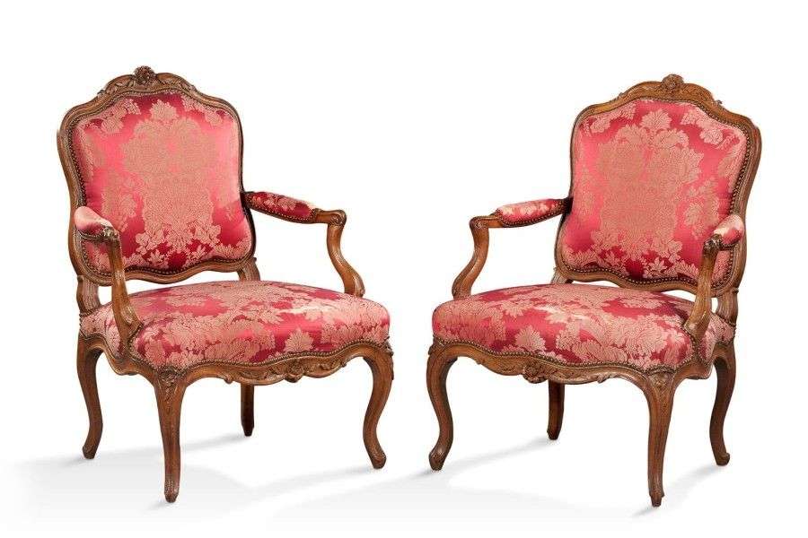 Paire de larges fauteuils à dossier plat dit «à la Reine» en noyer sculpté
