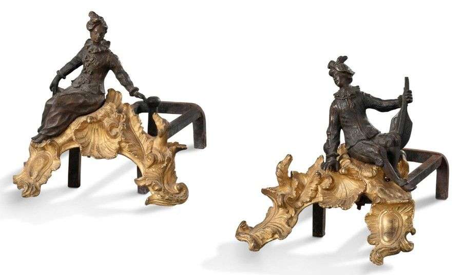 Paire de chenets en bronze ciselé, doré et patinés ornés de deux personnages de la Comédia del Arte, reposant sur des bases rocaille.