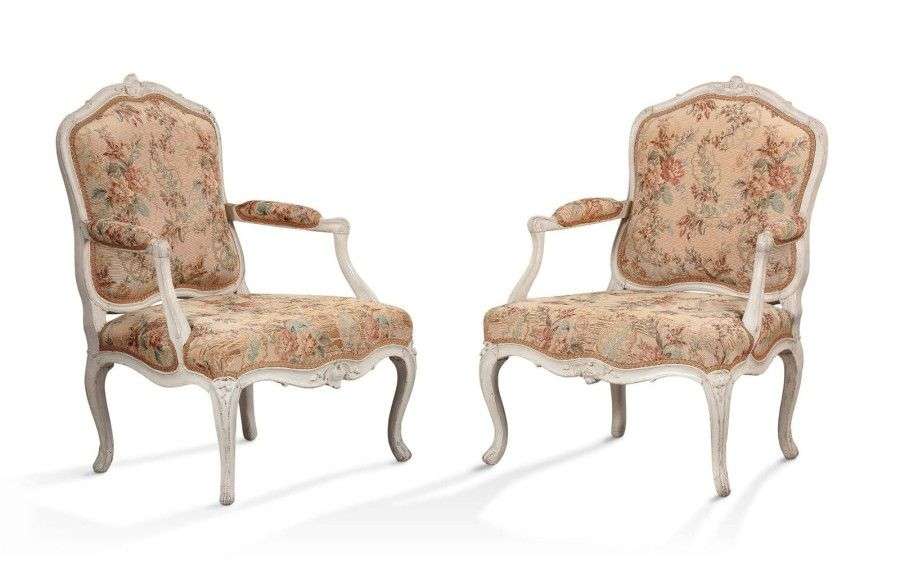 Paire de fauteuils à dos plat, en bois mouluré sculpté et relaqué crème à décor de coquilles, fleurettes et acanthes.