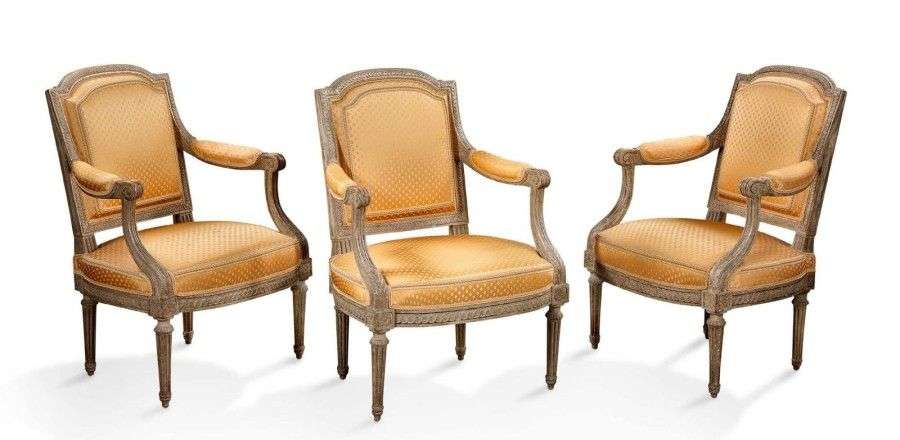 Suite de trois fauteuils à dossier plat en bois laqué gris.
