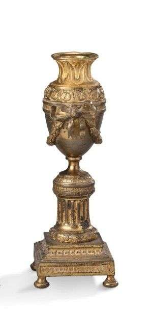 Les vases reposent sur des colonnes cannelées et bases carrées. Deux noeuds de rubans retiennent des guirlandes de laurier.