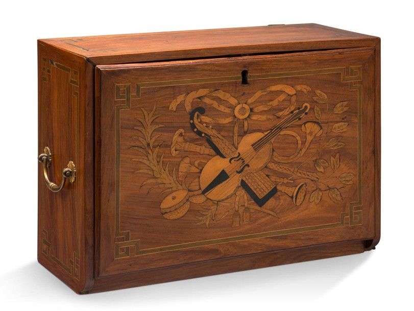 Petit secrétaire écritoire de carrosse en placage de bois de rose marqueté en façade d'instruments de musique, noeud de ruban et branchages.
