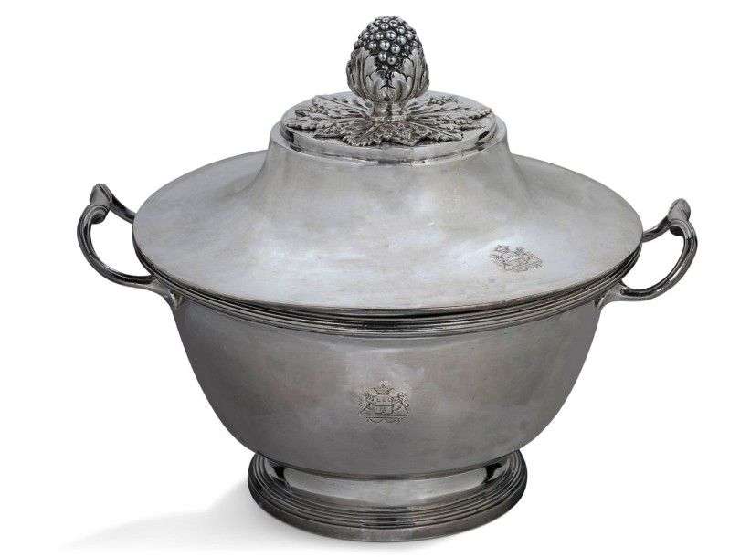 Soupière circulaire en argent posant sur un piédouche souligné de filets, le motif repris sur le col. Les anses sont traitées en volutes et le corps orné d'une armoirie. Doublure en argent et prise du couvercle en forme de bourgeon sur un tertre feuillagé.