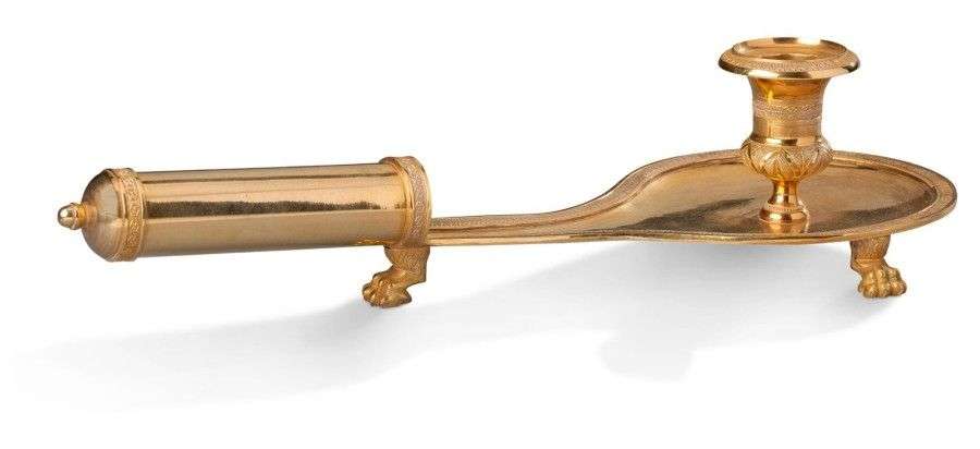 Rare bougeoir à main en bronze ciselé et doré, à décor de frises de rais d