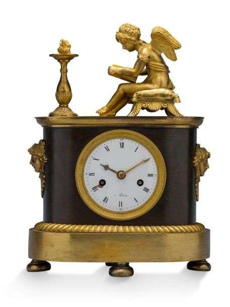 Pendule de forme ovoide en bronze patiné et bronze doré.