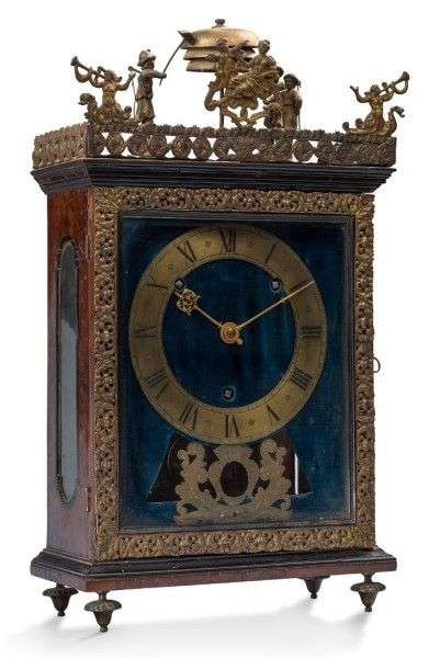 Curieuse pendule automate marquetée en loupe de noyer et ébène| le recouvrement supporte trois timbres frappés par trois jacquemarts| le pourtour dans une galerie ajourée à postes centrée de Vénus et Cupidon encadrés de deux renommées. La porte vitrée soulignée d'une frise de rinceaux et fleurettes| elle repose sur des petits pieds toupies godronnés. Le cadran annulaire indique les heures en chiffres romains et les minutes en chiffres arabes, il est posé sur un fond de velours bleu (remplacé) et surmonte une plaque gravée feuillagée.