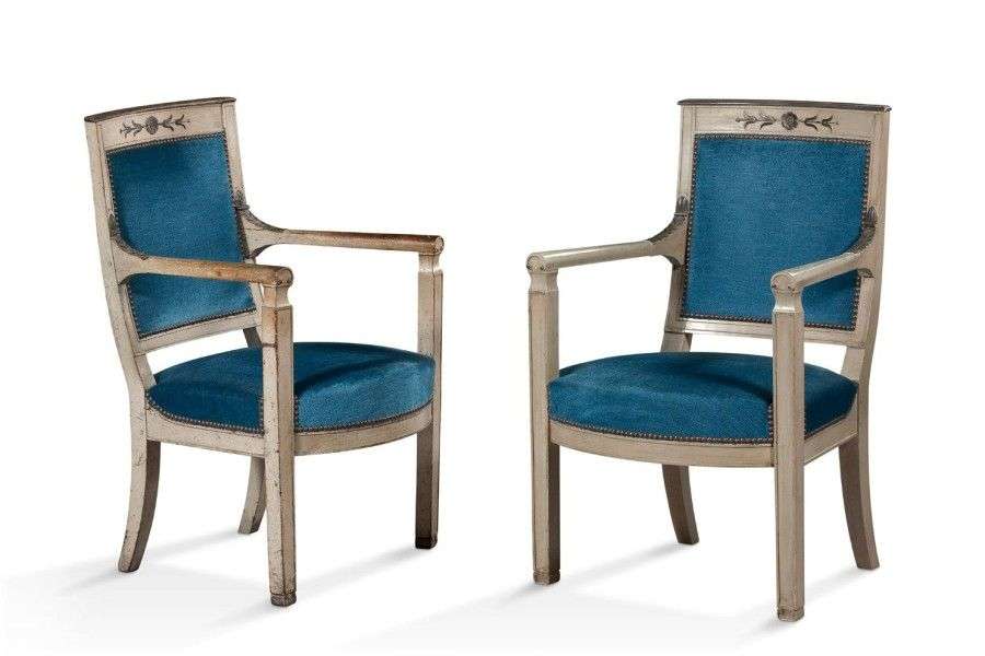 Paire de fauteuils en bois laqué gris clair, rechampis gris foncé.