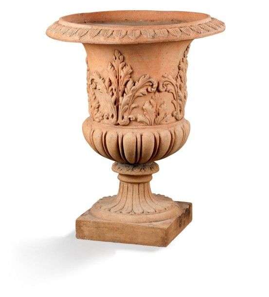 Paire de vases dits Médicis en terre cuite, les cols à frises de palmettes, les panses à larges feuilles d'acanthe en applique, les culots à godrons. Le piédouche circulaire à feuilles de laurier stylisées. Base quadrangulaire.