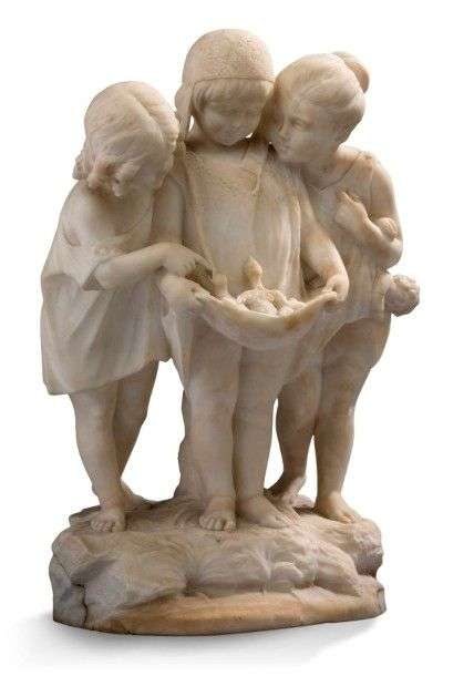 Groupe en marbre blanc représentant trois enfants aux oisillons