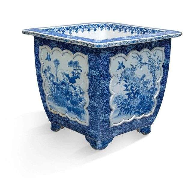 Paire de cache-pots en porcelaine décorée en bleu sous couverte de volatiles volant dans un paysage fleuri dans des réserves polylobées. Bords débordants plats et pieds d'angle.
