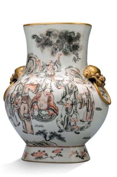 Vase en porcelaine à décor d'immortels dans un paysage peint en grisaille| les bords et prises à têtes de chiens dorés.