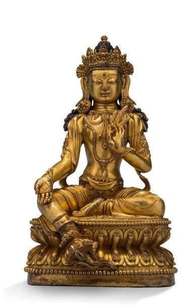 C'est une sculpture toute en délicatesse et en finesse, même si les détails sont simultanément extrêmement précis et bien ressortis, ce qui correspond bien à la production qui a suivi la période Yongle. A l'époque de Yongle, en effet, de splendides images bouddhiques ont été réalisées dans les ateliers impériaux, suivant l'influence du bouddhisme tibétain, Michael Henss pense cependant que les bronzes de style Yongle non estampillés d'une marque, comme celui-ci, doivent avoir été réalisés juste après ce règne ou par de grands artistes ayant travaillé pour Yongle, mais oeuvrant ensuite de façon libre, et ce parfois jusqu'après 1435, si bien que nous pouvons trouver la même qualité de travail et la même expressivité artistique que dans les pièces impériales. La base en double lotus est également typiquue de ce style, ainsi que la souplesse du dhoti, épousant les formes des jambes, de même pour la musculature du buste et la préciosité des bijoux. La main droite de Vasudhara esquisse la varadamudra, tandis que la gauche en vitarka mudra présente des épis de céréale, symbolisant l'abondance et de riches moissons. Le visage est extraordinairement vivant, esquissant un doux sourire, afin d'exprimer l'expression de douceur bénévolente de Vasudhara, les traits sont d'une exquise finesse et d'un raffinement spécifique à ce grand art du XVème siècle. La chevelure est remontée en un chignon élaboré, retenu par une couronne à 8 pointes ornées de pierres sur le devant, tandis que deux mèches de cheveux ondulent sur les épaules. La forme et la précision des bijoux, la sensualité du visage, la forme légèrement recourbée des oreilles, les joues pleines, ainsi que la petite dépression au-dessus de la bouche, sont autant d'indices correspondant à la stylistique de la période Yongle, auxquels viennent s'ajouter le raffinement du rendu des ge