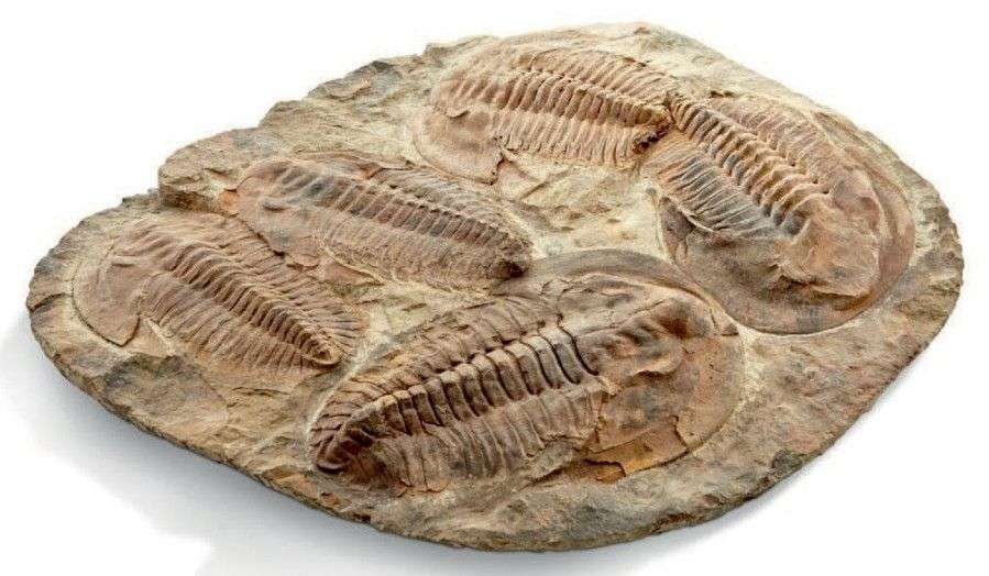 Une plaque de trilobite Andalousiana présentant 5 spécimens. Cambrien moye