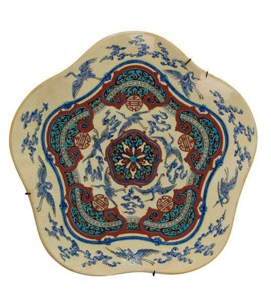 Important plat mouvementé en faïence émaillée jaune à décor polychrome de hérons en vol dans des nuages et de motifs floraux stylisés en réserve.