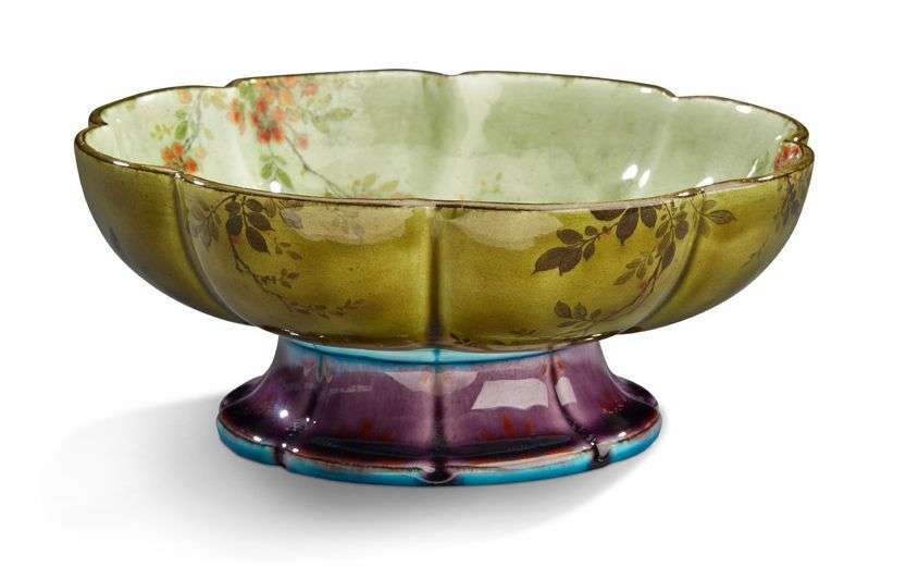Coupe polylobée sur piédouche en faïence émaillée vert et aubergine à décor polychrome d'oiseau en vol et de papillons.