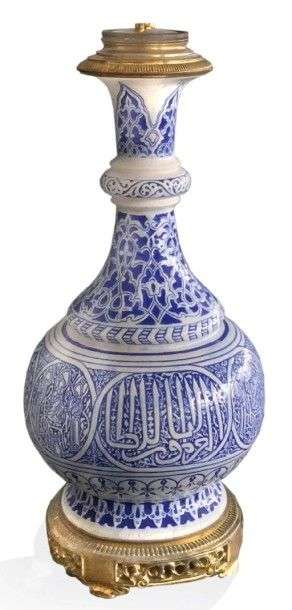 Lampe de forme balustre en céramqiue émaillée blanche et bleue à décor d'Iznik figurant des voeux à un sultan, monture en bronze doré.