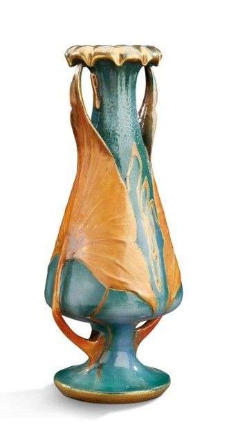 Vase de forme balustre à deux anses en faïence émaillée bleu nuancé vert à décor de larges feuilles de ginkgo biloba orange à rehaut d'or.